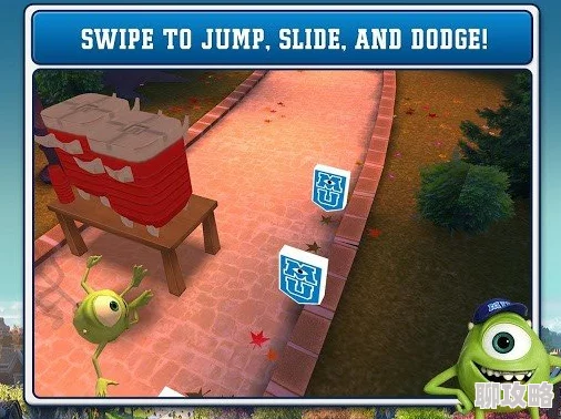 《怪兽大学》游戏的基本玩法是跑酷,操作起来非常简单,左右滑动可以改变奔跑的路径,向上滑动是跳跃,向下滑动是滑行,由于游戏的视角是斜45度角鸟瞰,因此有些时候会带来比较奇怪的方向感,当出现十字路口和多条路径的时候,玩家并不需要手动选择,系统会自动根据小猪阿奇奔跑的方向,把大眼怪带到相应的路径上去。